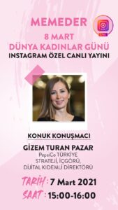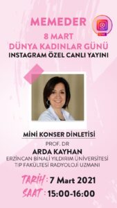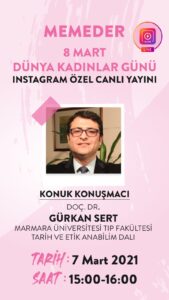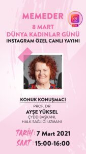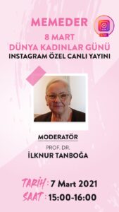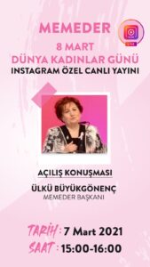 Dünya Kadınlar Günü Özel Yayını 8 Mart Dünya Kadınlar Günü etkinliklerimizin ilki, 7 Mart 2021 günü 15:00-16:00 saatleri arasında memeder instagram hesabı üzerinden özel canlı yayın ile gerçekleştirilecek.